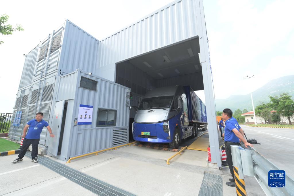 2023年8月24日,重型卡车在福州绕城高速公路长乐服务区的“骐骥”重卡换电站换电。新华社记者 林善传 摄