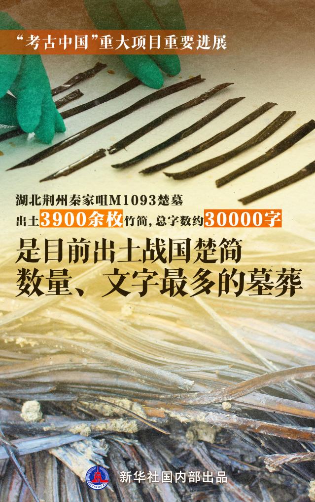 国家文物局12月21日举行第四季度例行新闻发布会,通报湖北省荆州市秦家咀墓地等4项“考古中国”重大项目重要进展。秦家咀M1093楚墓是目前出土战国楚简数量、文字最多的墓葬。