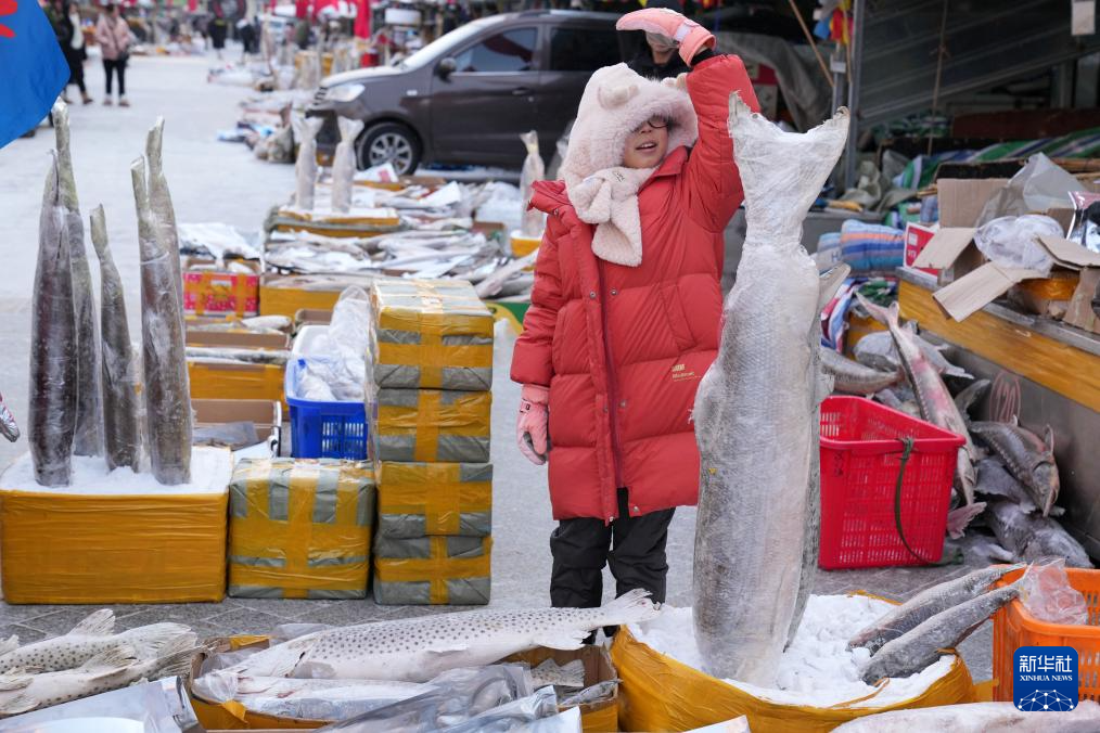 1月29日,在抚远市的东极鱼市,“小荔枝”在与插在冰里的大鱼比个头。