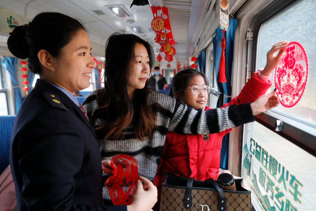 透过车窗,田地覆满积雪,一个个村庄被前行的列车抛在身后。冬日阳光映得窗户上的“福”字格外温暖,小年这天,归家心切已经挂在脸上。