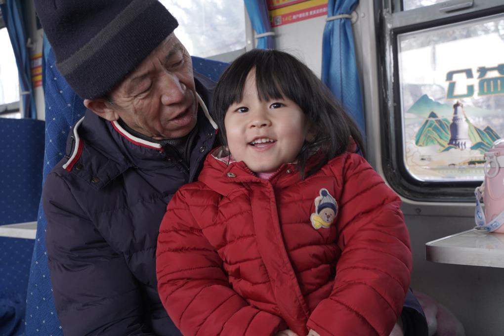 爷爷带着孙女乘坐8818次列车与儿子团聚。(申鹏飞 摄)
