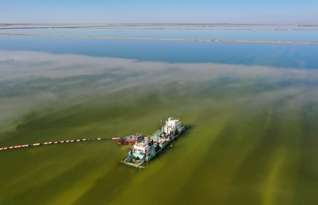 2023年2月2日,水采船在察尔汗盐湖中作业。新华社记者 张宏祥摄