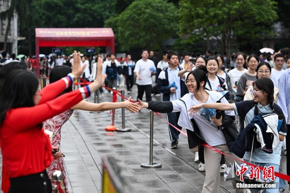 6月7日,重庆市第十一中学校考点,老师为进入考场的考生加油鼓劲。当日,2024年全国高考拉开帷幕。中新社记者 何蓬磊 摄