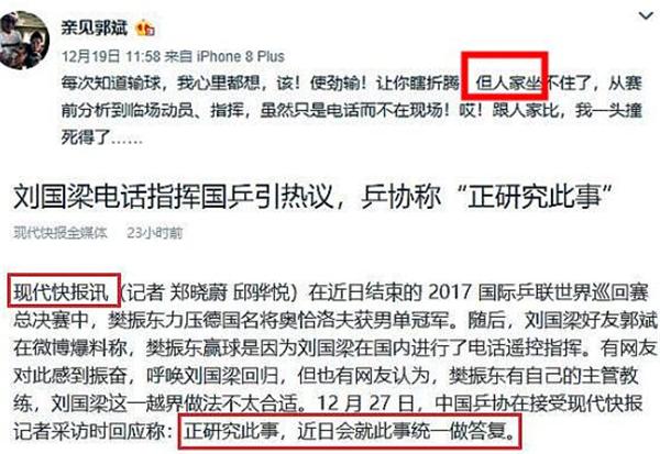 国际乒联总决赛男单决赛樊振东战胜德国人奥恰洛夫为国乒正名后,王楠老公、刘国梁生意伙伴郭斌爆料说:“人家坐不住了,从赛前分析到临场动员、指挥,虽然只是电话而不在现场!”球迷们在为刘国梁以“电话指点樊振东”重回国乒的方式而兴奋之余,也有不少球迷害怕郭斌爆料刘国梁的消息,会给他带来一些不必要的麻烦。