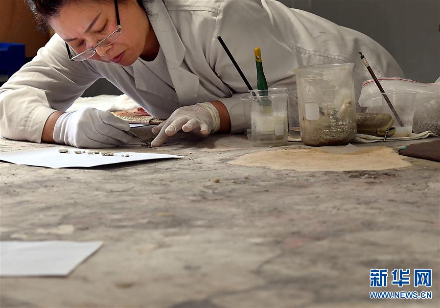 洛阳古代艺术博物馆壁画修复中心的修复师在工作室内修复一幅明代壁画(2017年5月16日摄)。
