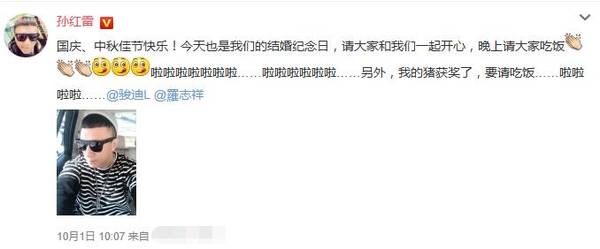 10月12日,网友“娱姬小妖”发微博称孙红雷妻子疑似怀孕,衣着宽松,孕味十足。他还配文称:“《极限挑战》停播后,好先生孙红雷一直陪伴妻子左右,近日小妖两次偶遇,孙红雷妻子都是宽松t恤装扮备受照顾,看上去孕味十足。说起来,结婚三年,现年47岁的颜王爷也早该当爹了,这次会不会真的有好消息呢?”并且放上了相关视频。