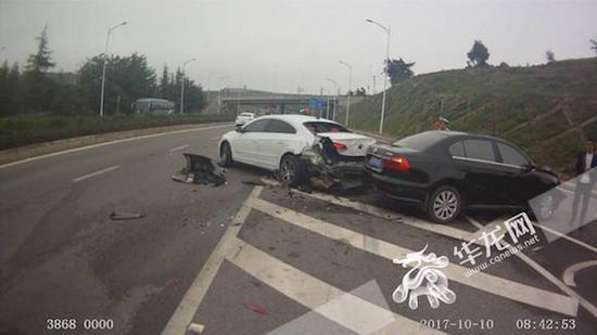 10月10日8时40分许,渝北区319国道浅水湾匝道处发生一起严重的追尾事故。渝北公安分局交巡警支队保税港区大队民警接到报警,赶至现场发现,一辆黑色朗逸和一辆白色的大众CC尾部停在一起。朗逸车头部的保险杆脱落,左右大灯损坏,发动机损坏裸露,全部安全气囊弹出;大众CC的后保险杠脱落,后挡风玻璃碎裂,左右尾灯损坏,后备箱严重变形;CC轿车驾驶员的鼻腔撞裂,民警见状赶紧送受伤人员去医院救治。