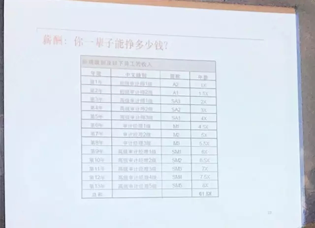 此外,他认为作为一个类似于ACCA学员的财会精英人才,未来的职场薪酬也是非常可观的。他为大家展示了一般经理级别及以下员工工作13年的收入状况,每一年的薪资都成阶梯状增长趋势,从第一年的年薪10万到第13年的年薪80万,而这13年的薪资总计高达615万。因此,建议大家把目光放得长远些,坚持自己的财会梦想。