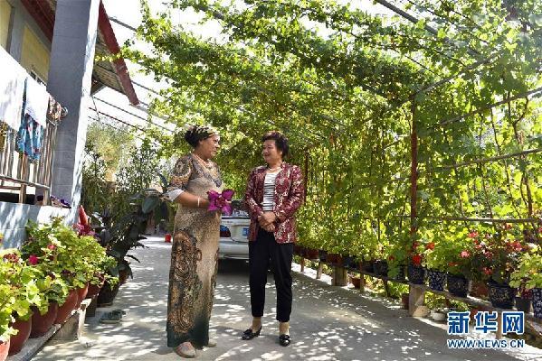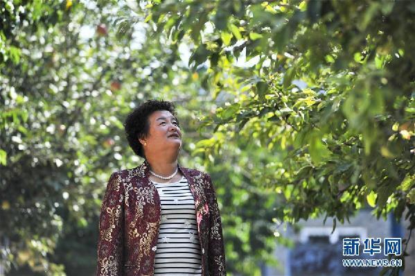 盖买村村支书李元敏在查看村民庭院林果的长势(9月14日摄)。 新华社记者 胡虎虎 摄