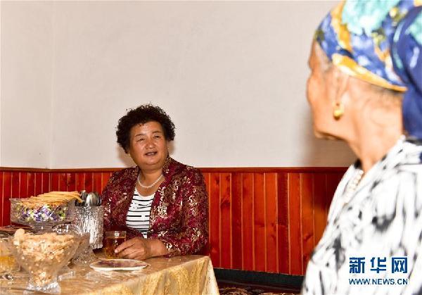 盖买村村支书李元敏(右)在向村民吐尔逊布·阿布都海米提了解生活近况(9月14日摄)。新华社记者 胡虎虎 摄